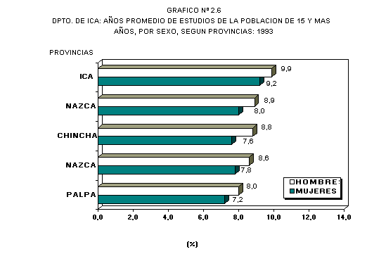 Las provincias donde es mayor la proporción de la población sin nivel de educación son: Palpa (8,3%), Nazca (7,7%), Chincha y Pisco (5,7% cada una).