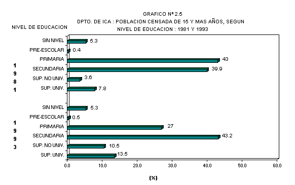 El nivel educativo de la población del departamento de Ica, ha experimentado un notable incremento respecto a 1981 al haber aumentado la población con educación secundaria y superior.