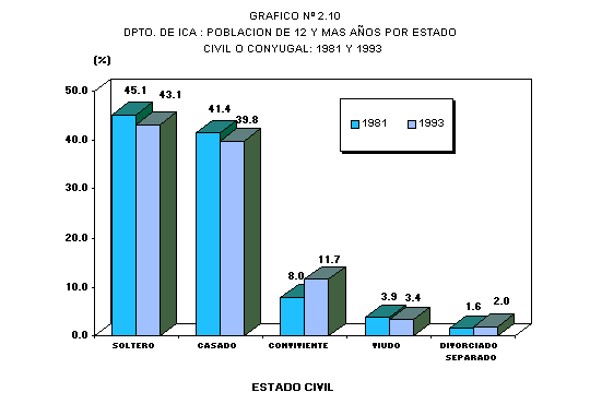 Al analizar el comportamiento del estado civil o conyugal de la población del departamento de Ica, se observa una ligera disminución de los solteros cuya proporción pasa de 45,1% en 1981 a 43,1% en 1993. La categoría de casados también disminuye su importancia relativa de 41,4% en 1981 a 39,8% en 1993. Similar tendencia se observa en la población de viudos.
