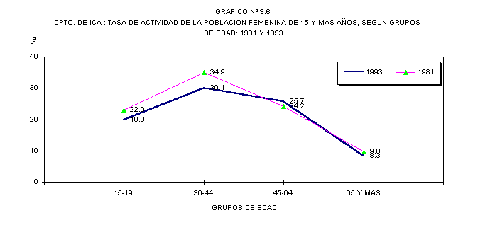 De otro lado, la tasa de actividad femenina registra un aumento, pasando de 22,9% en 1981 a 25,4% en 1993, lo cual se sustenta fundamentalmente en el aumento de las mujeres del grupo de 30 a 44 años en la actividad económica que aumenta de 30,1% en 1981 a 34,9% en 1993. En 1981, por cada 100 mujeres entre 15 y 29 años de edad el 19,9% integraban la PEA. En 1993 esta proporción ha aumentado a 22,9%. En el grupo de edad de 65 y más años la tasa de actividad femenina ha aumentado de 8,3% a 9,0%.
