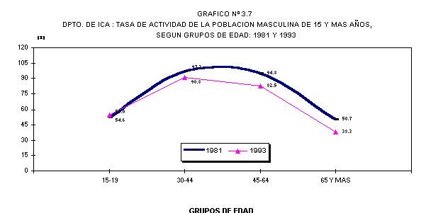 La reducción de la tasa de actividad de la población, entre los dos censos, se presenta fundamentalmente en los grupos de mayor edad. La tasa de actividad del grupo de edad de 45 a 64 años se reduce de 61,4% en 1981 a 53,6% en 1993 y en el grupo de 65 y más años, esta tasa disminuye de 30,0% a 23,6%, respectivamente. Este comportamiento se explica por el desplazamiento de PEA hacia la NO PEA, en calidad de pensionista o jubilado.