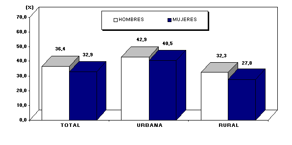 (41,7%) que en la rural (30,0%). La asistencia según sexo