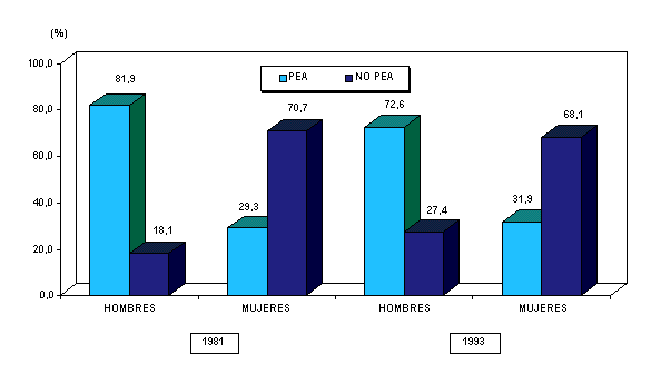 Durante el período 81-93 cabe destacar que la población femenina disminuye su proporción dentro de la NO PEA, de 70,7% en 1981 a 68,1% en 1993, indicando una mayor participación de la mujer en las actividades económicas. En cambio, la población masculina incrementa su proporción dentro de la NO PEA. De 18,1% en 1981 a 27,4% en 1993.