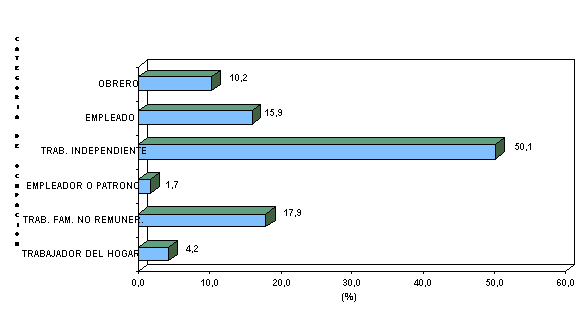 TOTAL 1/ OBRERO EMPLEADO TRABAJ. INDEPENDIENTE EMPLEADOR O PATRONO TRABAJ. FAM. NO REMUNERADO TRABAJ. DEL HOGAR | 28459 30300 157295 1995 24723 8146 | 11,3 12,1 62,7 0,8 9,9 3,2 | 29646 46190 145798 4798 52094 12281 | 10,2 15,9 50,1 1,7 17,9 4,2 |
