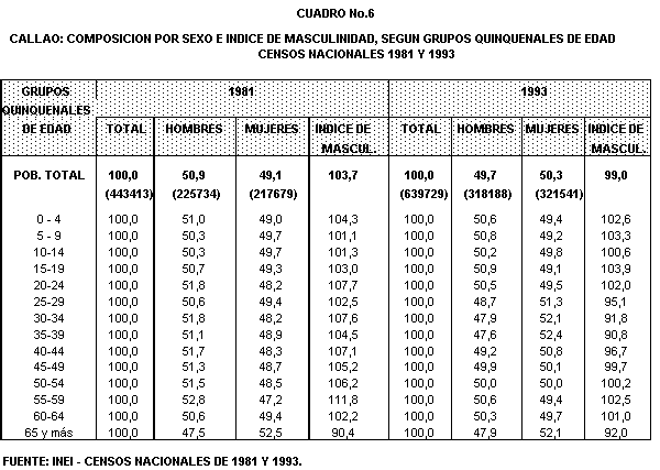 Según grupos de edad (cuadro Nº6 ), los valores más áltos , que adopta el indicador, corresponden al grupo de 15 a 19 años, en le que hay cerca de 104 hombres por cada 100 mujeres. Comparando los dos últimos Censos, en 1981 el predominio de la población femenina se da a partir de los 65 años . En cambio en 1993,este predominio se registra a partir de los 25 años de edad, con excepción de los grupos quinquenales de edad 55-59 y 60-64 años.