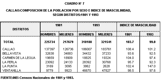 A nivel distrital (cuadro Nº7), se observa qye existe un predominio de población masculina en los distritos de La Punta y Callao, siendo el primero, el distrito con un mayor predominio de población masculina, 147 hombres por cada 100 mujeres, distrito en el cual se ubica un contingente considerable de población militar.