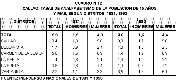 En la población femenina el analfabetismo es más acentuado, observándose que de cada 100 mujeres 4 no saben leer ni escribir, en cambio de cada 100 hombres 2 son analfabetos. Esta situación es más crítica en los distritos de Callao, Carmen de la Legua y Ventanilla.