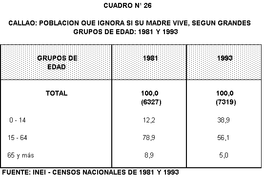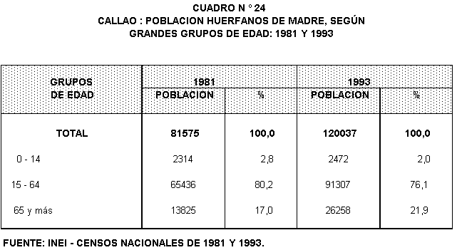 Comparando la proporciones de huérfanos de madre, según grandes grupos de edad en los dos últimos censos se aprecia una ligera disminución de la proporción de huérfanos en los menores de 15 años (de 2,8% en 1981 a 2,0% en 1993) y en el grupo de 15 a 64 años (de 80,2% a 76,1%), en tanto que la proporción ha crecido en el grupo de 65 y más años (de 17,0% a 21,9%).