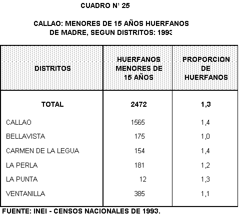 Considerando sólo la población menor de 15 años de edad, se encuentra que la proporción de huérfanos de madre es de 1,3% para la provincia. Algunos distritos tienen una proporción ligeramente mayor como es el caso de los distritos del Callao y Carmen de la Legua (1,4%) y Bellavista es el distrito con menor proporción de huérfanos (1,0%) menores de 15 años.