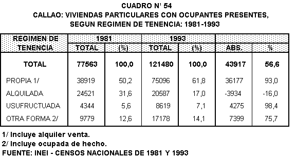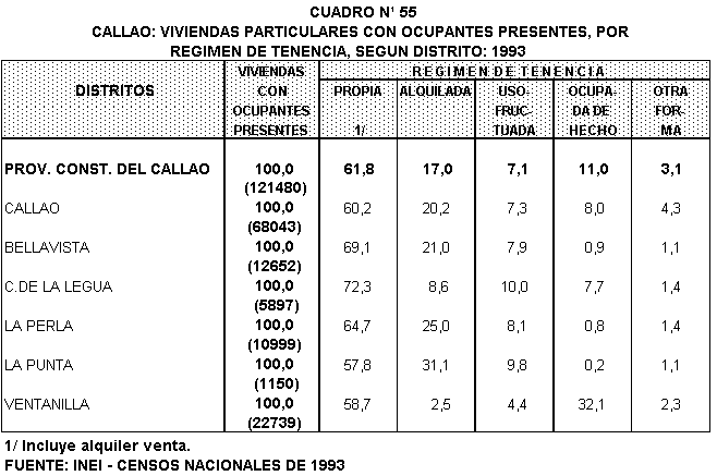 La tenencia de la vivienda corresponde a la condición de propietario, inquilino o uso de la vivienda por las personas u hogares que la ocupan. Las viviendas particulares con ocupantes presentes empadronadas en el Callao se incrementaron en 56,6% respecto a lo registrado en 1981.