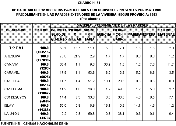 A nivel provincial cuatro de las ocho provincias con que cuenta el departamento presentan una considerable proporci\n de viviendas cuyas paredes est<n construidas con adobe \ tapia. Los porcentajes varRan entre 33,8% para la provincia de Condesuyos y 59,6% para La Uni\n.