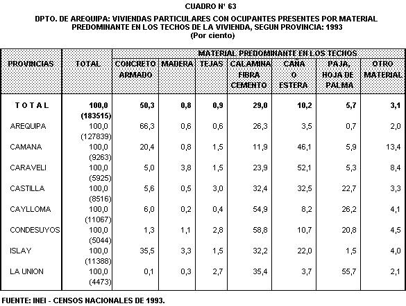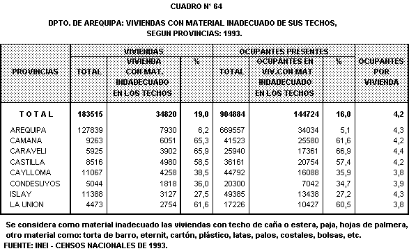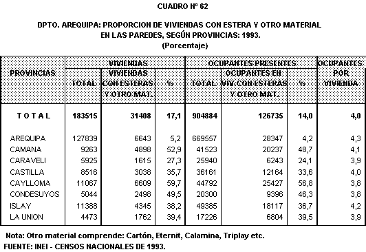 Con relaci\n a las viviendas que utiliza en las paredes, esteras y otro material se observa que del total de provincias, Caylloma y Caman< presentan la mas alta proporci\n 59,7% y 52,9%, respectivamente.