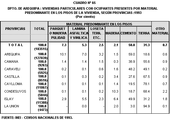 La calidad de los pisos de las viviendas, constituye otro elemento para caracterizar las condiciones de habitabilidad. En 1993, los materiales que m<s predominan en los pisos de las viviendas del departamento son el cemento y la tierra con 50,8% y 31,3%, respectivamente.