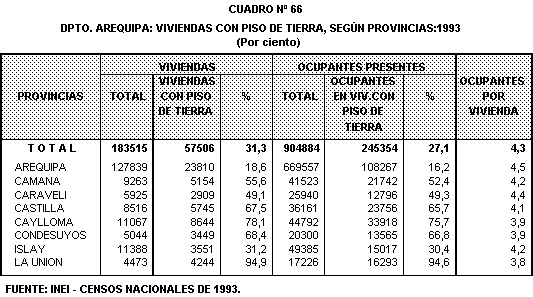 A nivel provincial, La Uni\n, Caylloma y Condesuyos presentan el mayor ndmero de viviendas con piso de tierra. En La Uni\n, 9 de cada 10 viviendas tienen esta caracterRstica y albergan a 16,293 personas.