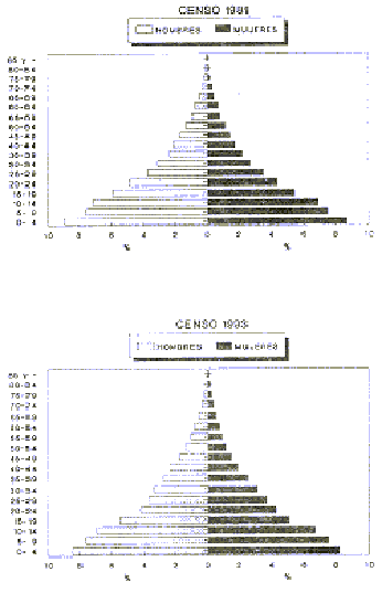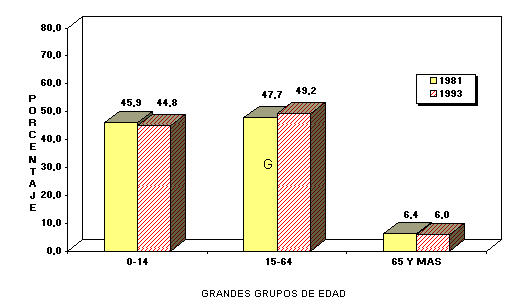 En 1993, la pirámide por edad presenta una ligera reducción en las edades menores y un pequeño incremento en las edades intermedias, lo que significa que la edad mediana de la población, aumentó de 17 a 18 años durante el período intercensal 1981 - 1993. Este comportamiento se aprecia al comparar las pirámides de los Censos de 1981 y 1993 (Ver gráfico Nº 1.8).