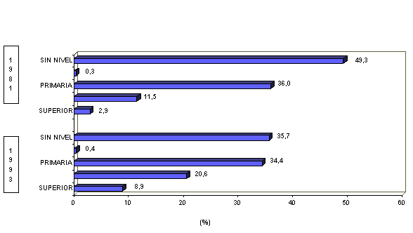 En 1993, el nivel de instrucción de los hombres, al igual que en 1981, es más alto que el de las mujeres. La proporción de hombres sin instrucción es de 20,4% y de mujeres 50,2%. El porcentaje de hombres con instrucción superior es mayor (10,8%), al de mujeres (7,1%). Sin embargo, las diferencias en 1993 se han acortado en relación a las que existían en 1981.