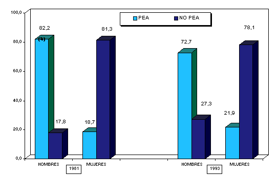 Por sexo, la población femenina disminuye su proporción dentro de la NO PEA, de 81,3% en 1981 a 78,1% en 1993, indicando una mayor participación de la mujer en las actividades económicas. La población masculina presenta un mayor incremento en su proporción dentro de la NO PEA. De 17,8% en 1981 a 27,3% en 1993.