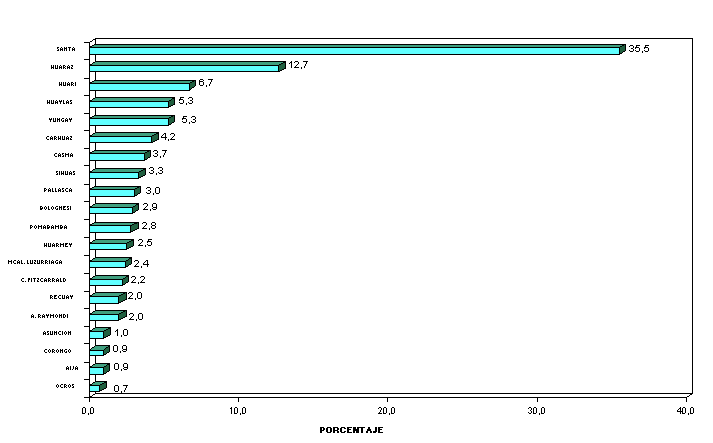 TOTAL HUARAZ AIJA ANTONIO RAYMONDI ASUNCION BOLOGNESI CARHUAZ CARLOS F. FITZCARRALD CASMA CORONGO HUARI HUARMEY HUAYLAS MARISCAL LUZURIAGA OCROS PALLASCA POMABAMBA RECUAY SANTA SIHUAS YUNGAY | 993596 126967 8879 19475 10166 28539 41396 21654 37030 9112 65655 24766 52935 24267 7066 29140 27030 19600 354385 32971 52563 | 100,0 12,8 0,9 2,0 1,0 2,9 4,2 2,2 3,7 0,9 6,6 2,5 5,3 2,4 0,7 2,9 2,7 2,0 35,7 3,3 5,3 |