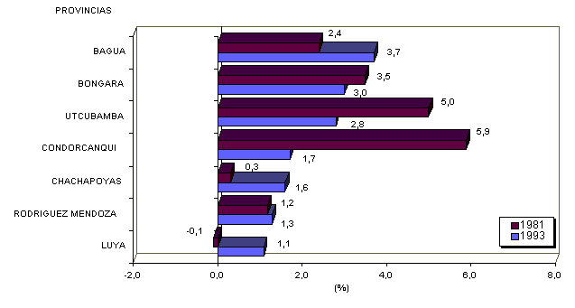 En el primer grupo, con un crecimiento por encima de la tasa media anual departamental, se ubican tres provincias: Bagua con 3,7%, Bongara con 3,0% y Utcubamba con 2,8%.