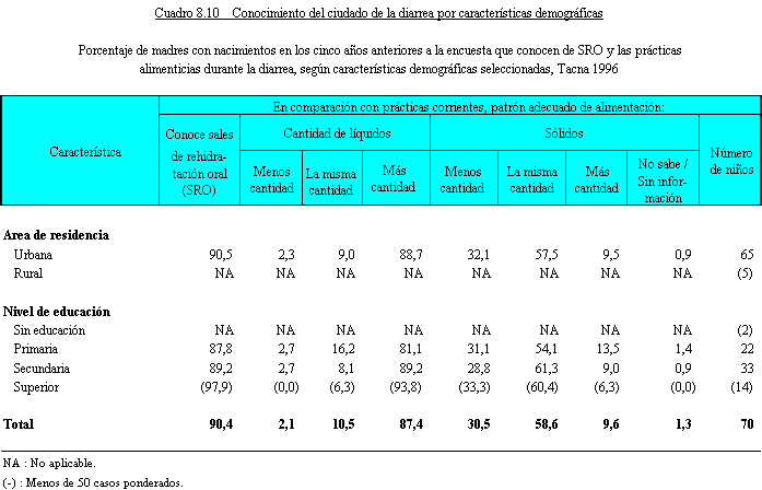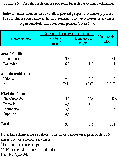 Uno de los objetivos de ENDES 1996 fue recolectar información sobre episodios de diarrea en las últimas dos semanas, entre los hijos actualmente vivos menores de 5 años de las mujeres entrevistadas, y también acerca del conocimiento para el cuidado y el tratamiento que recibieron los niños que habían sufrido algún episodio.