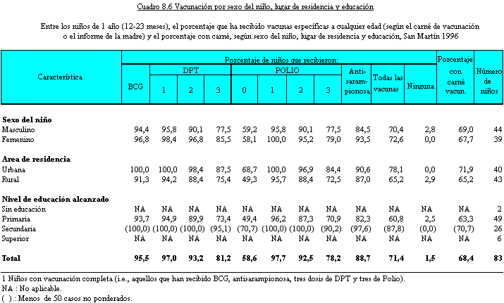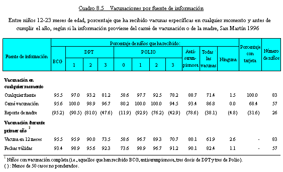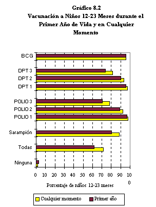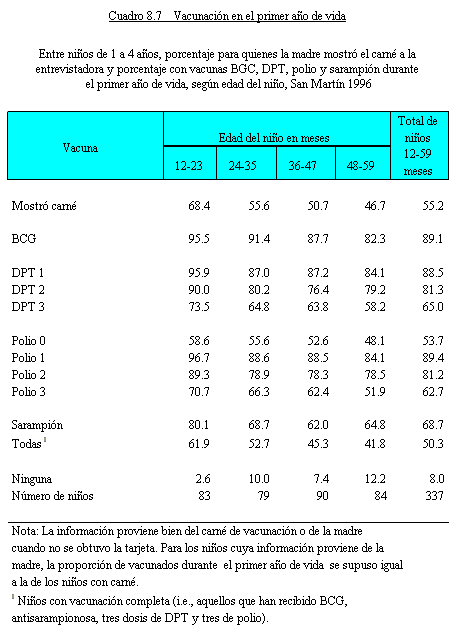 En los últimos 5 años, la proporción de niños que recibió todas las vacunas recomendadas (BCG, Sarampión, Tres de DPT y tres contra la Poliomielitis), fue de 71% en 1996.