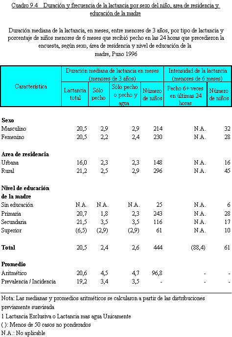 Duración mediana y frecuencia de la lactancia