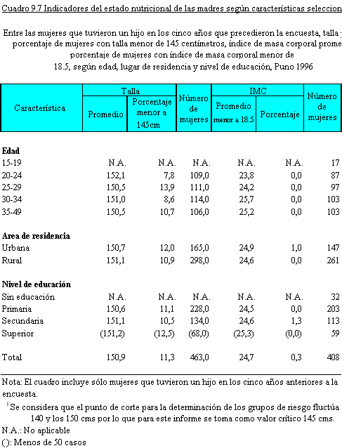 el Cuadro 9.7. Así mismo los valores promedios y el porcentaje