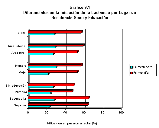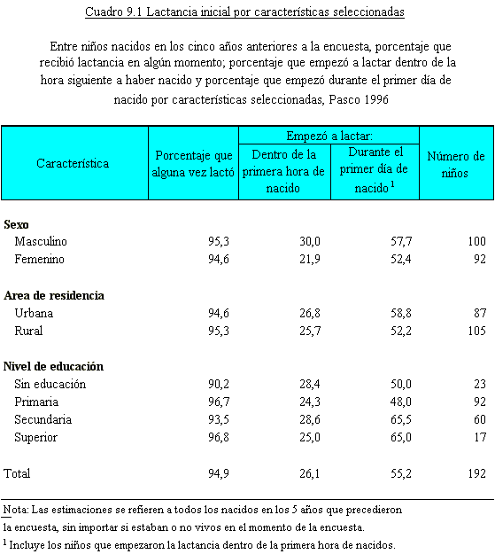 Como puede apreciarse, la lactancia continúa siendo práctica generalizada en el departamento de Pasco. El 95 por ciento de los niños nacidos en los cinco años anteriores a la ENDES 1996, han lactado alguna vez. Este porcentaje es casi el mismo por sexo del niño, el área de residencia y el nivel educativo de la madre.