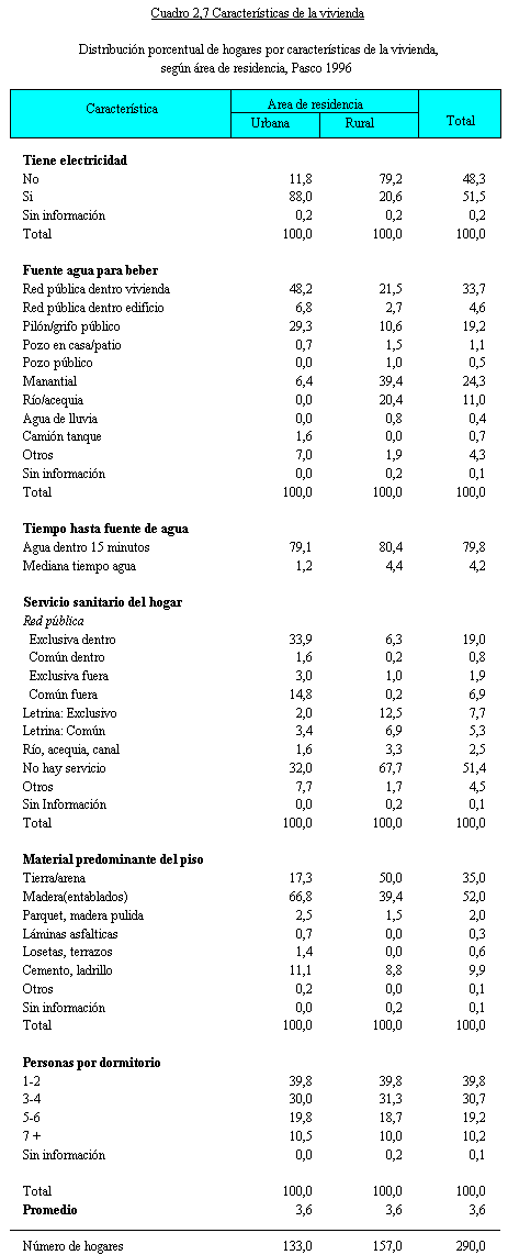 Diferentes niveles de satisfacción de las necesidades básicas de salud, educación y vivienda representan variados niveles de bienestar económico y social en una población. La disponibilidad y acceso a servicios básicos adecuados tales como agua, electricidad, servicio de alcantarillado y condiciones de higiene se encuentra asociada con mejores condiciones de supervivencia de la población y de los niños en particular. La información recogida en el cuestionario del hogar de ENDES 1996 permite conocer la disponibilidad de los servicios básicos en la vivienda pasqueña hacia el año 1996 (Véase el Cuadro 2.7 y el Gráfico 2.1).