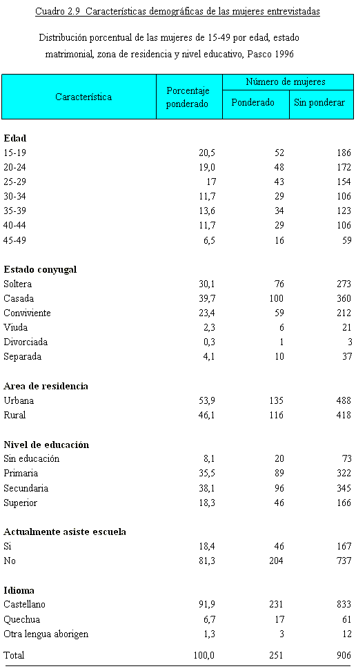 En la ENDES 1996, fueron entrevistadas individualmente 906 mujeres de 15 a 49 años. Las entrevistadas se concentran en los primeros grupos de edad fértil: más de la mitad de las mujeres (57%) son menores de 30 años.