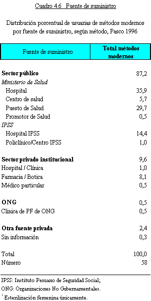 ! Los principales proveedores de mJtodos anticonceptivos son el Ministerio de Salud y el Instituto Peruano de Seguro Social, instituciones pdblicas que cubren las necesidades del 87 por ciento de las usuarias actuales.