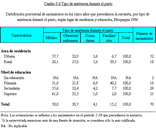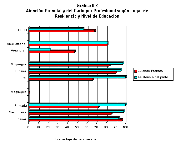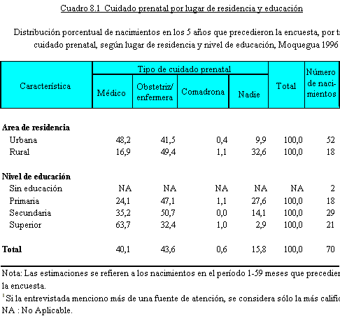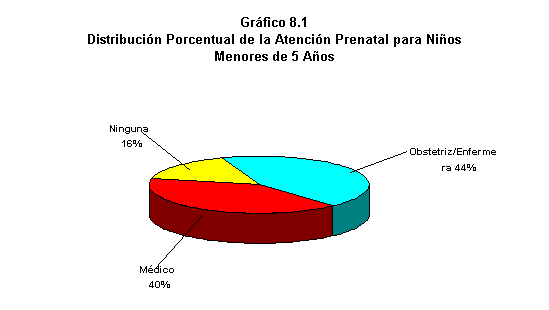 En el Cuadro 8.1 se presenta la distribución porcentual de nacimientos en los cinco años que precedieron la encuesta, por tipo de cuidado prenatal, según edad de la madre y orden de nacimiento y en el Cuadro 8.2 por lugar de residencia y nivel de educación. En el Gráfico 8.1 se presenta información sobre el tipo de cuidado prenatal.