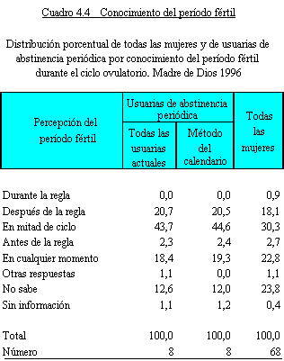 El resto de usuarias tiene un conocimiento inadecuado (43%) o no sabe nada sobre el particular (13%) y, como tal, están utilizando el método del ritmo en forma incorrecta, dando lugar a que algunas de ellas queden embarazadas sin quererlo.