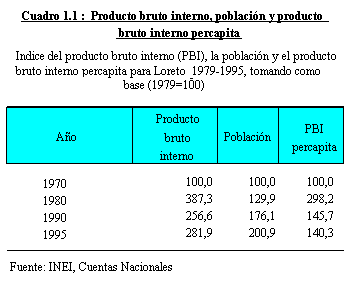 En el período de 1990-1995, la Región de Loreto registra una tendencia positiva de su Tasa de Crecimiento promedio anual. La producción de la economía regional se incrementó en 1.9% como conse- cuencia de la reactivación económica del país.