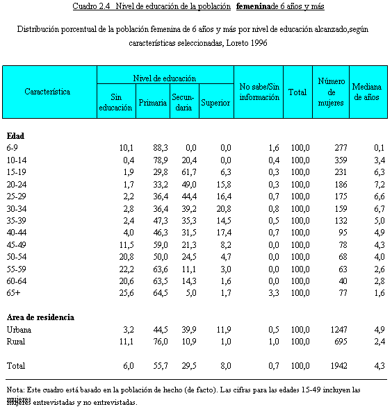 El nivel de educación de la población de un país es uno de los factores más frecuentemente usado en los análisis socio-demográficos. Los niveles de educación de la población de 6 años o más registrada en el cuestionario del hogar, según edad, y área de residencia se presentan en el Cuadro 2.4 para la población femenina, en el cuadro 2.5 para la masculina y en el cuadro 2.6 para la población total.
