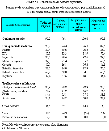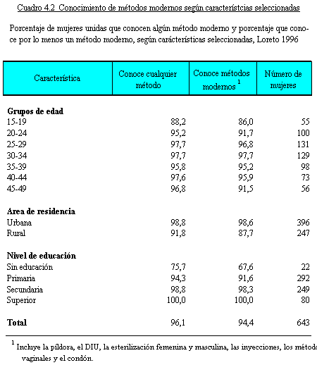 La información de los Cuadros 4.1 y 4.2, revela que el conocimiento de métodos para la regulación de la producción es muy amplio entre la población del departamento de Loreto. Prácticamente todas las mujeres en edad fértil han oído hablar de por lo menos un método de regulación de la fecundidad. La píldora y el dispositivo intrauterino (DIU) siguen siendo los más conocidos.