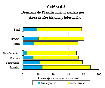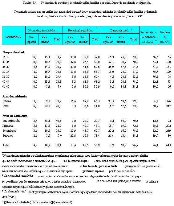 Los niveles de necesidad insatisfecha presentados en la sección anterior revelan sólo en parte el potencial de la demanda de planificación familiar en el país. La información de ENDES 1996 permite estimar la demanda total de tales servicios, tanto para espaciar como para limitar. La demanda total incluye tres componentes: