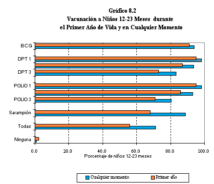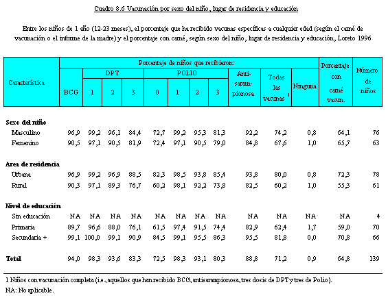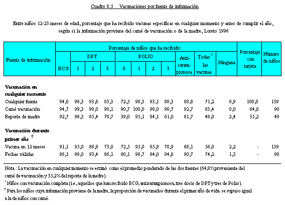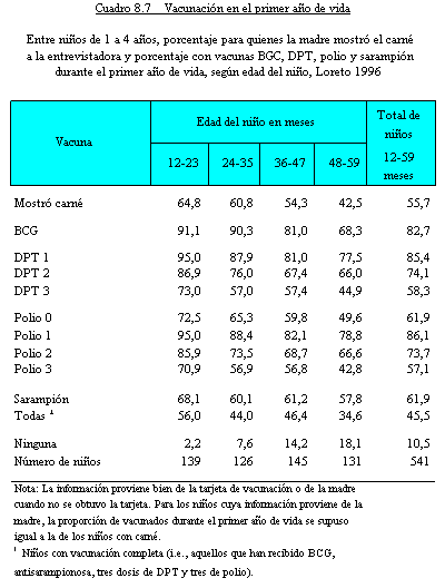 En los últimos 5 años, la proporción de niños que recibió todas las vacunas recomendadas (BCG, Sarampión, Tres de DPT y tres contra la Poliomielitis), fué de 71% en 1996.