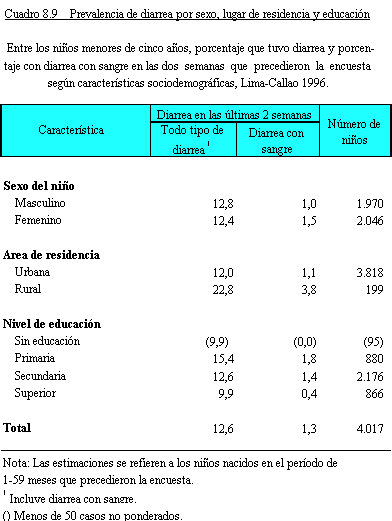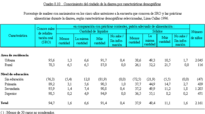durante la diarrea; su énfasis fue mayor por la epidemia del cólera. Al igual que en Endes anteriores, en ENDES 1996 se consideró importante evaluar la cobertura de ese conocimiento entre las madres de niños menores de 5 años, que son aquellas que más