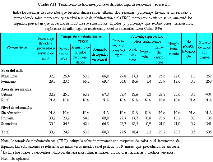 Para analizar los niveles y diferenciales del tratamiento de los episodios de diarrea, en los Cuadros 8.10 y 8.11 se presentan, según características seleccionadas, los porcentajes de menores de cinco años que tuvieron diarrea en las últimas dos semanas y que fueron llevados a un servicio o proveedor de salud, por un lado, y el porcentaje que recibió terapia de rehidratación oral (TRO), porcentaje a quienes se les aumentó