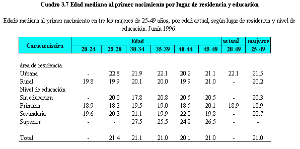 Edad medciana al primer nacimiento entre las mujeres de 25-49 años, por edad actual, según lugar de residencia y nivel de educación, Junín 1996