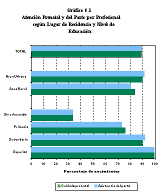 En el Cuadro 8.1 se presenta la distribución porcentual de nacimientos en los cinco años que precedieron la encuesta, por tipo de cuidado prenatal, según lugar de residencia y nivel de educación. En el Gráfico 8.1 se presenta información sobre el tipo de cuidado prenatal por esas mismas características.