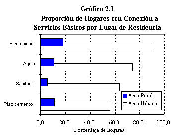 Diferentes niveles de satisfacción de las necesidades básicas de salud, educación y vivienda representan variados niveles de bienestar económico y social en una población. La disponibilidad y acceso a servicios básicos adecuados tales como agua, electricidad, servicio de alcantarillado y condiciones de higiene se encuentra asociada con mejores condiciones de supervivencia de la población y de los niños en particular. La información recogida en el cuestionario del hogar de ENDES 1996 permite conocer la disponibilidad de los servicios básicos en la vivienda huanuqueña hacia el año 1996 (Véase el Cuadro 2.7 y el Gráfico 2.1).
