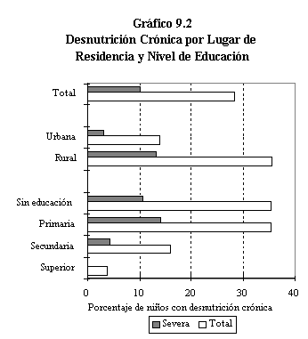 Los resultados se presentan en el Cuadro 9.5 por edad y en el Cuadro 9.6 por lugar de residencia. El Gráfico 9.2 resume los resultados de talla para la edad, según área de residencia y nivel de educación de la madre.