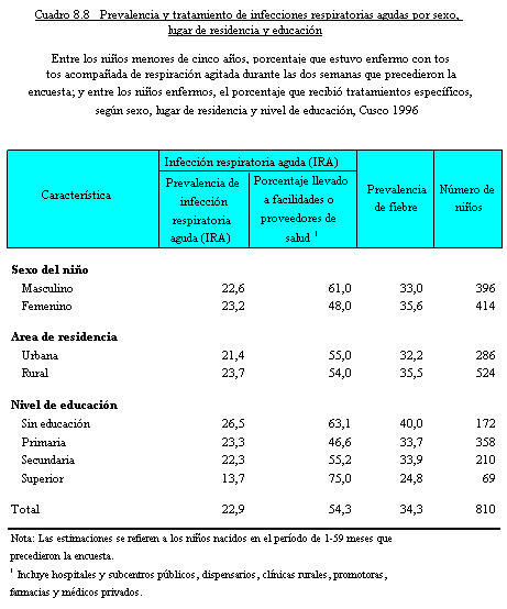 En el Cuadro 8.8 se presenta información sobre la prevalencia y tratamiento de infecciones respiratorias agudas por edad, sexo del niño, lugar de residencia y nivel de educación. Debe recordarse que la información obtenida en ENDES 1996 corresponde al período comprendido entre Julio y Noviembre de 1996.