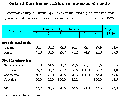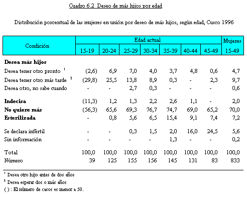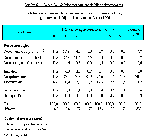Durante mucho tiempo, los administradores de programas de planificación familiar se preocuparon únicamente por las mujeres que deseaban limitar la fecundidad, prestando muy poca atención a aquéllas que deseaban espaciar los nacimientos. Se reconoce ya que hay un grupo grande de mujeres que quieren espaciar, especialmente si se tiene en cuenta que los nacimientos muy seguidos inciden en la salud y bienestar de los hijos. Por lo tanto en la ENDES 1996 se ha preguntado a aquellas mujeres que deseaban más hijos, cuánto tiempo les gustaría esperar para tener otro (o tener el primero para aquéllas sin hijos). Específicamente, a las nulíparas se les preguntó si deseaban tener hijos; al resto, si deseaban más hijos. A aquéllas que deseaban más hijos se les preguntaba sobre cuánto tiempo deseaban esperar para tener el próximo.