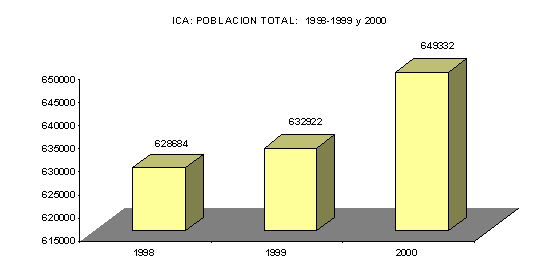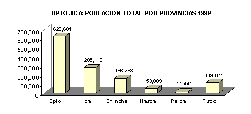 La población del departamento de Ica en el año de 1999 sería de 638,922 habitantes. La provincia de Ica tiene 285,110, seguida de la provincia de Chincha con 166,263 habitantes. Se estima que para el periodo 1999–2000 la tasa de crecimiento promedio anual departamental será de 1,6% y para la provincia de Ica en dicho período tendrá una tasa de crecimiento de 2,1%. DEPARTAMENTO DE ICA: POBLACION Y TASA DE CRECIMIENTO