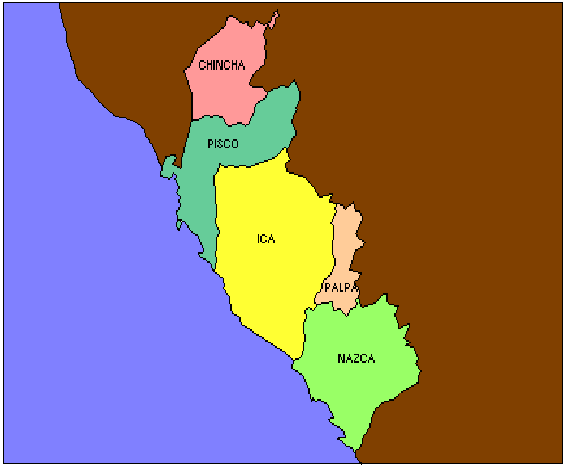 Esta superficie incluye 22.32 Km2 que es la superficie que tienen en conjunto las 17 islas existentes frente a sus costas. La altura del territorio de Ica oscila entre 2 metros sobre el nivel del mar (Distritos Paracas – Provincia de Pisco) y los 3796 metros sobre el nivel del mar (Distrito San Pedro de Huacarpana – Provincia de Chincha). El territorio de Ica abarca dos regiones naturales. Costa y Sierra. El 89% del área departamental correspondiente a la costa y solo el 11% al área de la Sierra. 2.3 CLIMA El clima es templado y desértico, la humedad atmosférica es alta en el litoral y disminuye hacia el interior. Las precipitaciones son escasas y normalmente inferiores a 15 m.m anuales. Solo excepcionalmente se producen lluvias de gran intensidad pero de corta duración y que tienen un origen extrazonal. En el sector de la sierra las lluvias son estacionales y de mayor intensidad. Las temperaturas máximas absolutas alcanzan 32.3°C en Ica y 27.4°C en Pisco. Las máximas absolutas 9.8°C en Ica y 12.6°C en Pisco. La insolación es alta en los desiertos de Pisco, Ica y Nasca. El viento Paracas, es una brisa marina de gran fuerza que sopla en la zona de Pisco– Paracas y que contribuye a despejar el cielo de estas áreas y de los desiertos contiguos. El clima andino es templado – Cálido en los Yungas, templado de altitud, frío en las Quechuas y templado frío en las Sunis y sectores de puna que pertenecen a su territorio 2.4 HIDROGRAFIA La vertiente del Pacifico u Occidental tiene una extensión aproximada de 290,000 km2 equivalente al 22% del área total del país y da origen, como consecuencia de las precipitaciones del deshielo de los nevados y glaciares en su parte alta, a 952 ríos que discurren hacia el Océano Pacífico siguiendo una dirección predominante al Sur Oeste: El río Ica es uno de ellos y se constituye en uno de los principales ríos del departamento junto con los ríos San Juan, Pisco y Grande. El Sistema hidrográfico del río Ica tiene su origen en un grupo de pequeñas lagunas situadas en la parte alta de la cuenca entre las cuales la más conocida es la de Pariona a lo largo de su recorrido el río Ica recibe como afluentes por la margen izquierda el río Capillas y el río Santiago de Chocorvos y por la margen derecha el río Tambillos que tiene confluencia del sector llamado Ramadillas a 64 km. de su naciente. Este río, aunque de caudal temporal, muy raras veces desde fines de diciembre vienen las avenidas ya que generalmente aparecen en los meses de enero a la primera quincena de abril. En la actualidad el río Ica se ve incrementado por las aguas de la laguna Choclococha y Orcoccocha lo que hace factible que su cauce lleve agua en los meses de mayo a noviembre según la necesidades del valle. El río Pisco, situado en la Región Central de la vertiente del Pacífico tiene su origen en la confluencia de los ríos Churis y Huaytará, a la altura de la localidad de Pampano. El Río Grande se encuentra ubicado en el sector meridional de la Región Central de la vertiente del Pacífico u Occidental, el sistema hidrográfico nace a base de precipitaciones que ocurren en las montañas de la parte alta de la cuenca. El Río San Juan tiene su origen en una serie de pequeñas lagunas ubicadas en las cercanías de la divisoria que separa las cuencas de los ríos Cañete y Mantaro. Entre las lagunas destacan la de Yunca Huarmi (Turpo) y Huarichinga, situadas a alturas aproximadas de 4100 y 4300 m.s.n.m. respectivamente. 2.4 DIVISION POLITICA El departamento de Ica, esta conformado por 5 provincias que son: Ica, Chincha, Pisco, Palpa y Nasca, tienen una densidad poblacional de 29.96 hab/km2 en el año 1999. La provincia de Ica tiene 7894.05 km2, Chincha 2987.35 km2, Nasca 5234.08 km2, Pisco 3957.15 km2 y Palpa 1232.88 km2. Las provincias de Chincha (55.66 hab/km2) e Ica (36.12 hab./km2) presentan las densidades demográficas mas altas del departamento pues en ellas confluyen los habitantes de nuestro departamento y de Lima, Ayacucho y Huancavelica, producto del flujo migratorio.