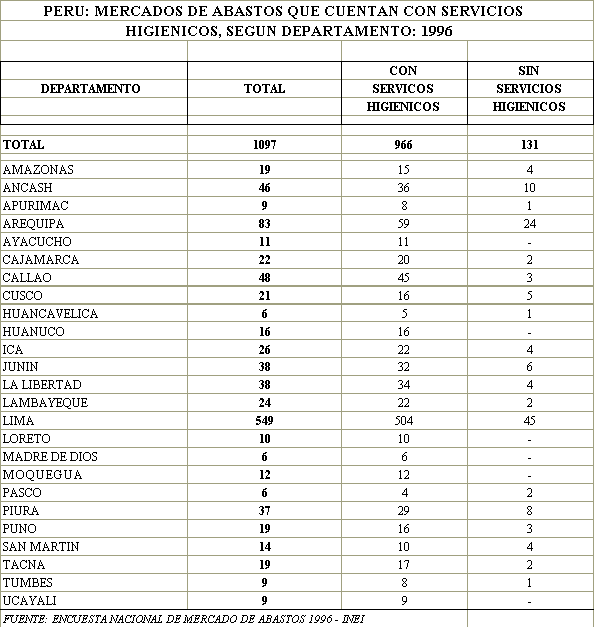 A nivel departamental los mercados mejor equipados en cuanto a disponibilidad de servicios higiénicos se encuentran ubicados en los departamentos de, Ayacucho, Huánuco, Loreto, Madre de Dios, Moquegua y Ucayali. La totalidad de los mercados de abastos ubicados en estos departamentos cuentan con servicios higiénicos.