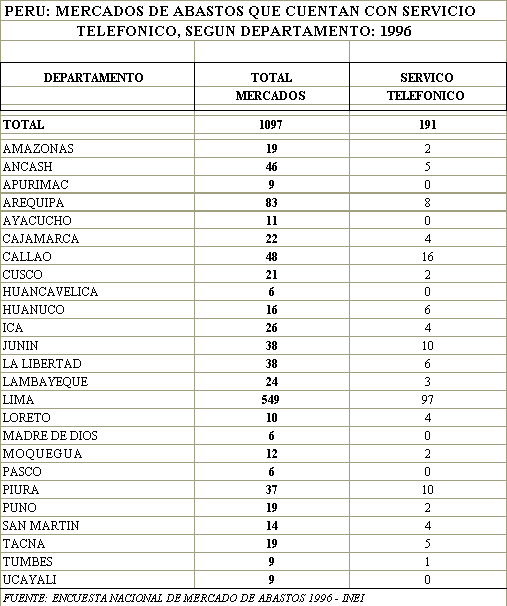 el 19% de sus mercados poseen servicio telefónico, porcentaje